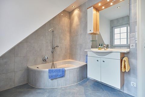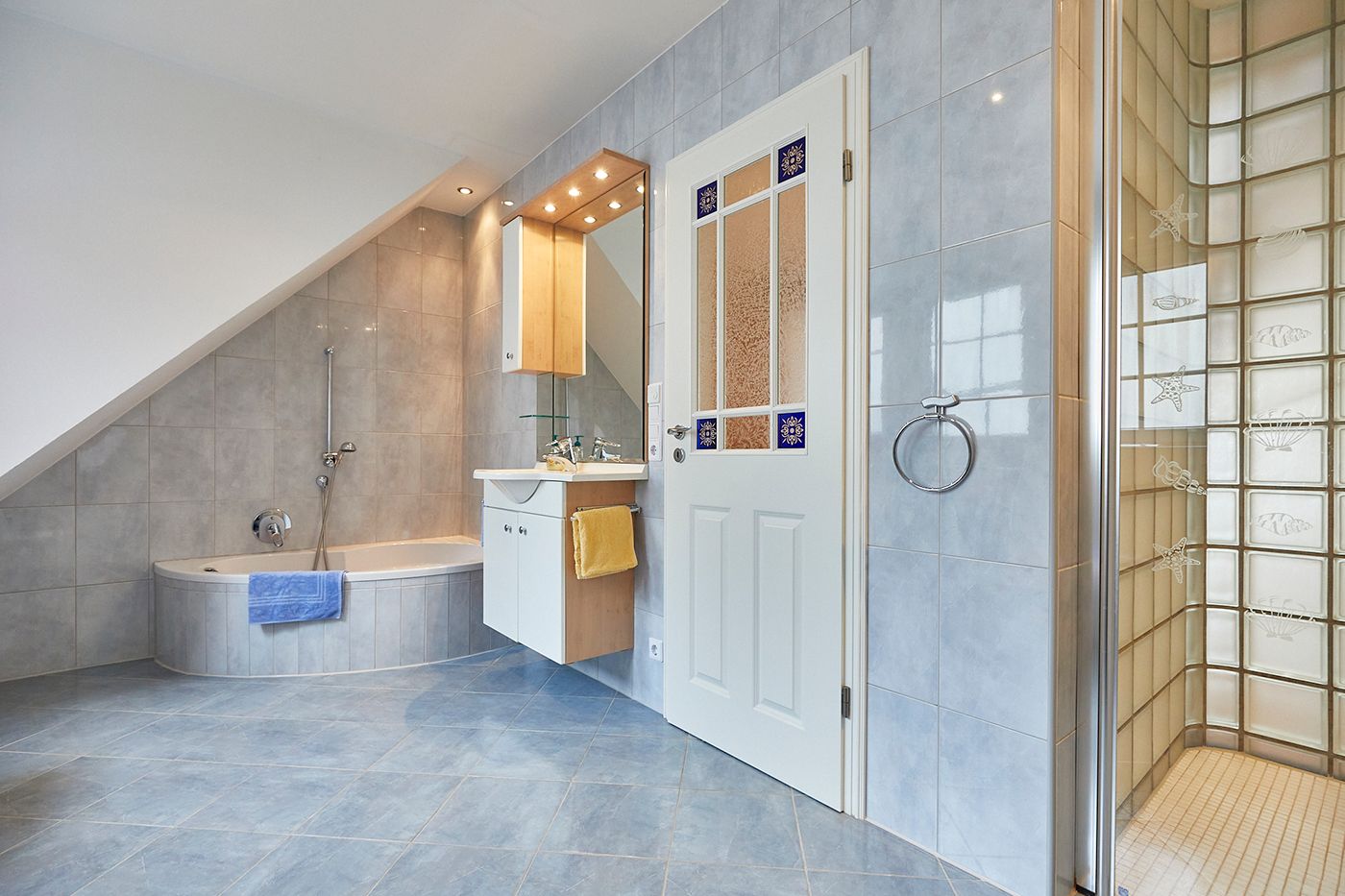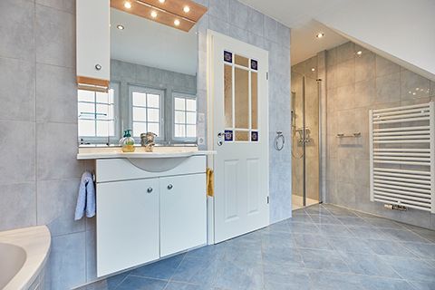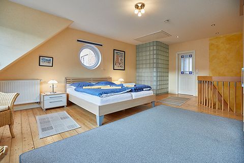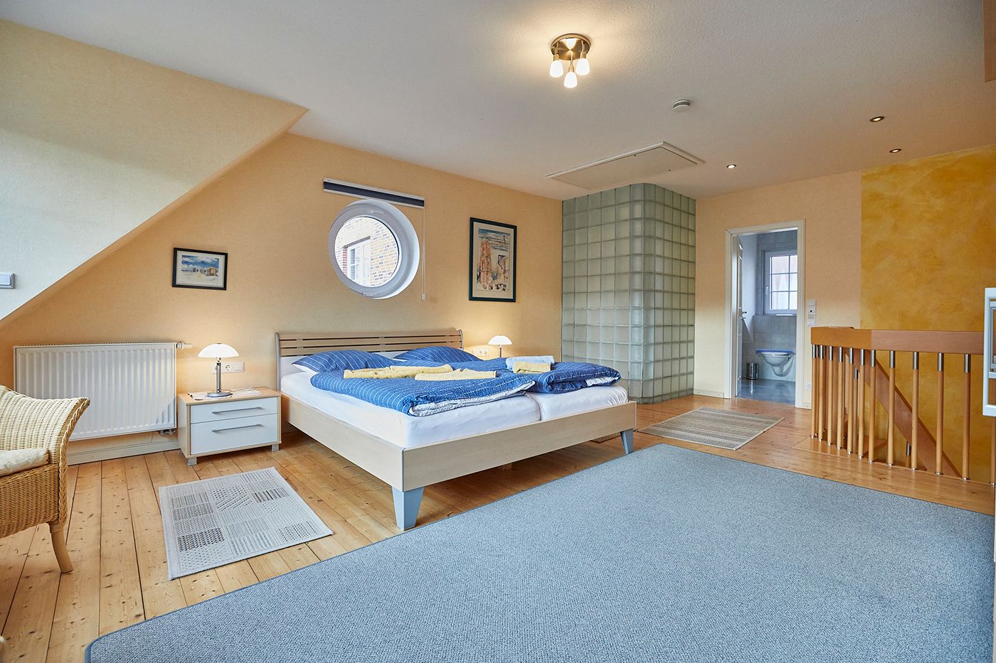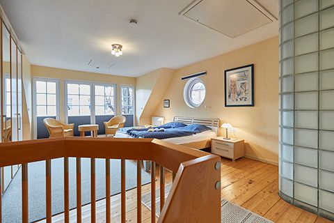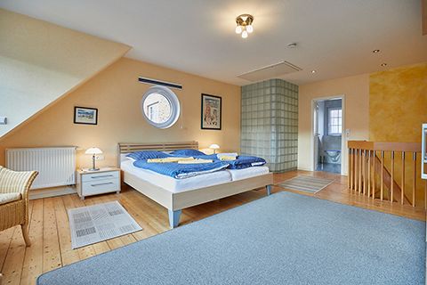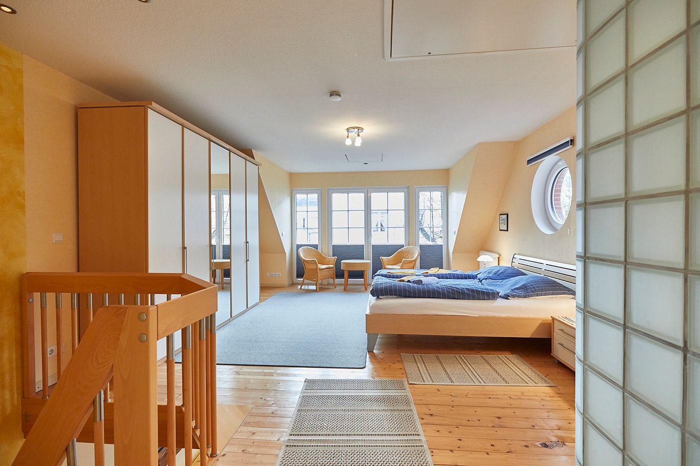 Eine Etage höher liegt das Traumland: Ein riesiges, lichtdurchflutetes Schlafzimmer mit Zugang zum Balkon. Ein Extra-Highlight auf dieser Etage ist das ebenfalls üppig dimensionierte Badezimmer. Neben einer Sitzdusche gibt es noch eine weitere Dusche, die sich, nur durch eine Glasbausteinwand getrennt, mehr im Schlafzimmer als im Badezimmer befindet.