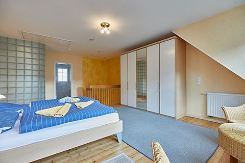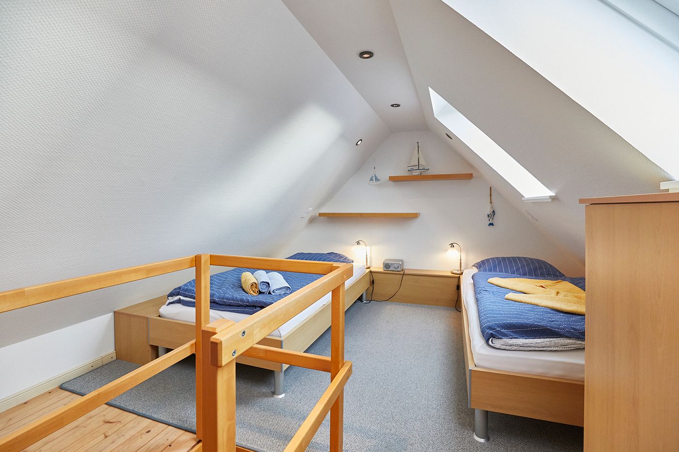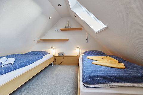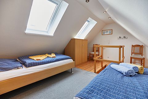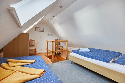 Im „Storchennest“ unter dem Dach befinden sich zwei Einzelbetten. Mit Dachschrägen auf beiden Seiten und Blick in den Sternenhimmel verspricht dieser kleine, aber gemütliche Schlafraum erholsame Nächte.