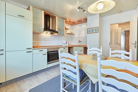 Die Küche ist groß, geräumig und ideal für ein gemütliches Frühstück. Darüber hinaus ist sie mit allem bestückt, was zu einer gut eingerichteten Küche dazugehört: Kühlschrank mit Gefrierfach, 4-Platten-Herd mit Dunstabzugshaube, Toaster, Kaffeemaschine und einiges mehr.
