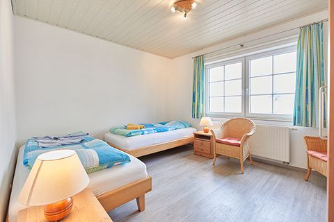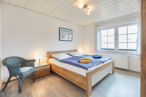 Das Schlafzimmer ist mit einem Doppelbett und einer kleinen Sitzecke eingerichtet. Im Garten stehen Sitzgelegenheiten und Strandkörbe zur gemeinschaftlichen Nutzung bereit.